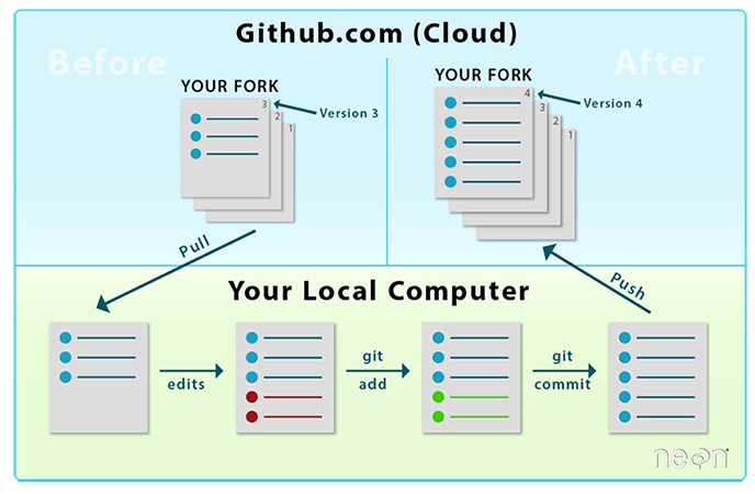 git push- If you are working on your local computer, and want your commits to be visible online on GitHub as well, you “push” the changes up to GitHub with this command.