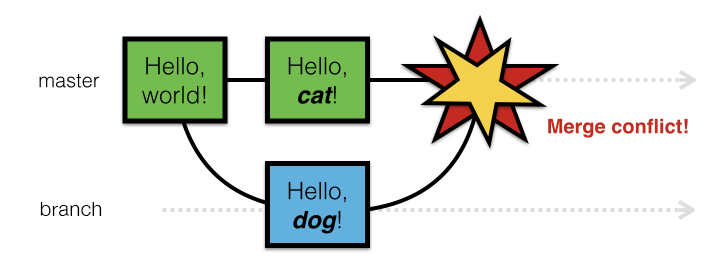 A conflict arises if two versions, for example the master and a branch worked on the same line of code. When the branch now tries to be merged back to the master, there will be a conflict.