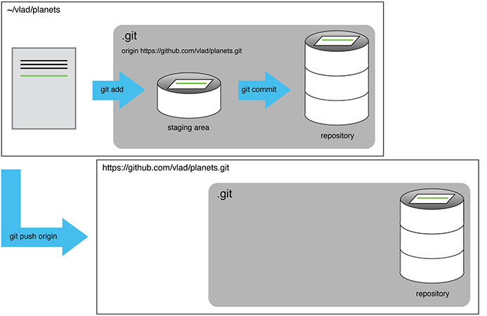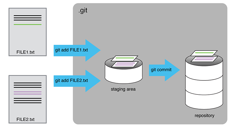 Putting your files into a repository and creating a version is actually a two-step process, consisting of adding (adding them to the stage) and then committing (putting the staged files into the repository) the files. This setup gives you better control over which files in your directory to commit and which not.